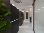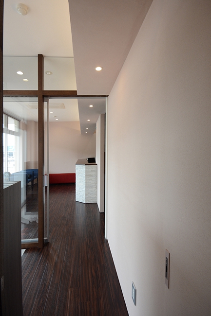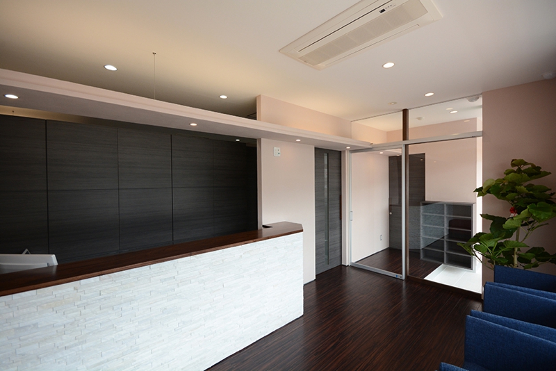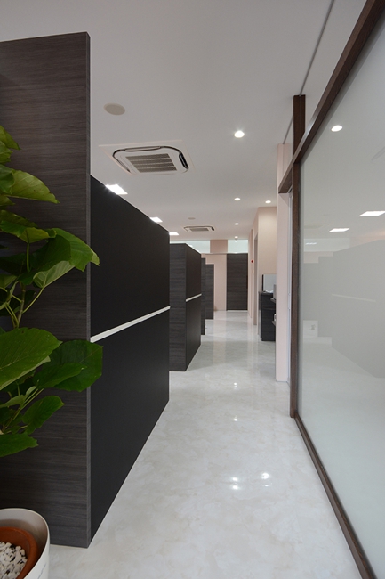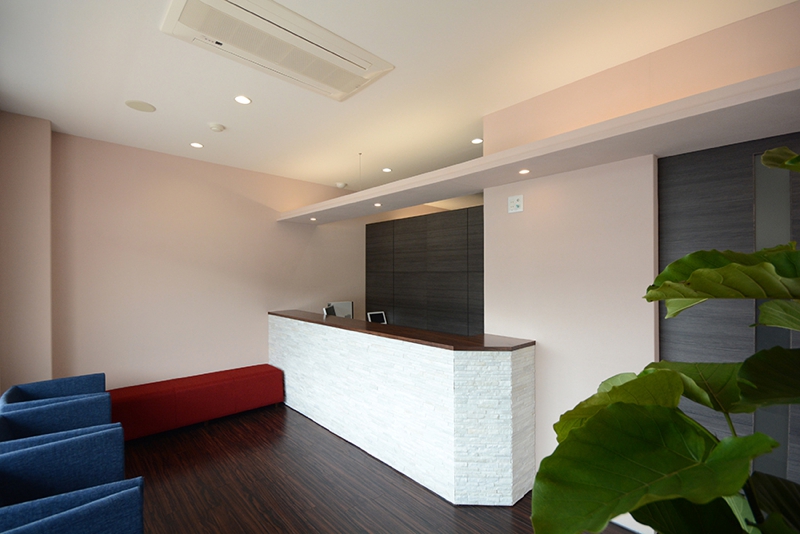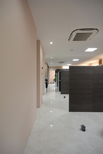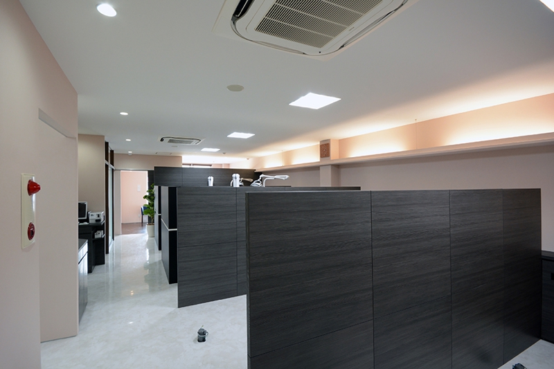 広島市の郊外、商業施設の間に位置する医療クリニックモールの一区画歯科内装設計です。レイアウトは正面から風除室を通り待合室へ、診察室はh=1600高さのパーティーションによる半個室体制、4台スペースを確保し、プラスで特診室のスペースを配置しています。インテリアは壁をジョリパッドの塗壁で、やわらかさと清潔感をつくりだし、柱型を利用し間接照明と組合わせた空間となっています。
