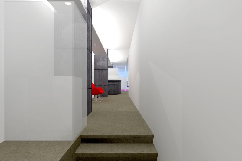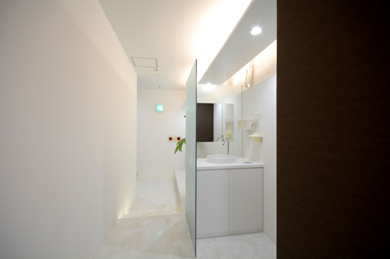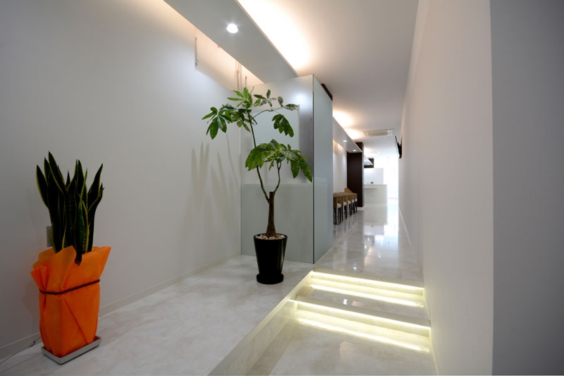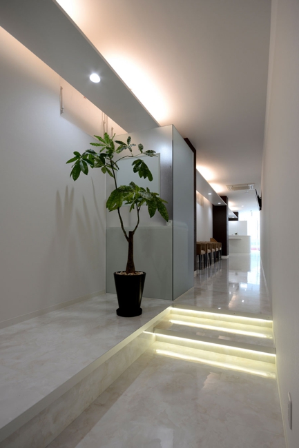 2階テナント50坪を床面積30坪の矯正歯科と20坪の事務所に区画することからの計画でした、EVホールからメイン道路に面する窓側の診察室へ導入するレイアウトにおいて、極端な細長い通路兼待合のスペースができ、そこは柱型を利用し間接照明と組合わせた空間となりました。全体の院内のイメージは白を基調とし、清潔感をつくりだしています。
