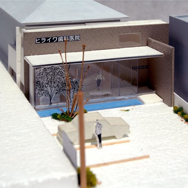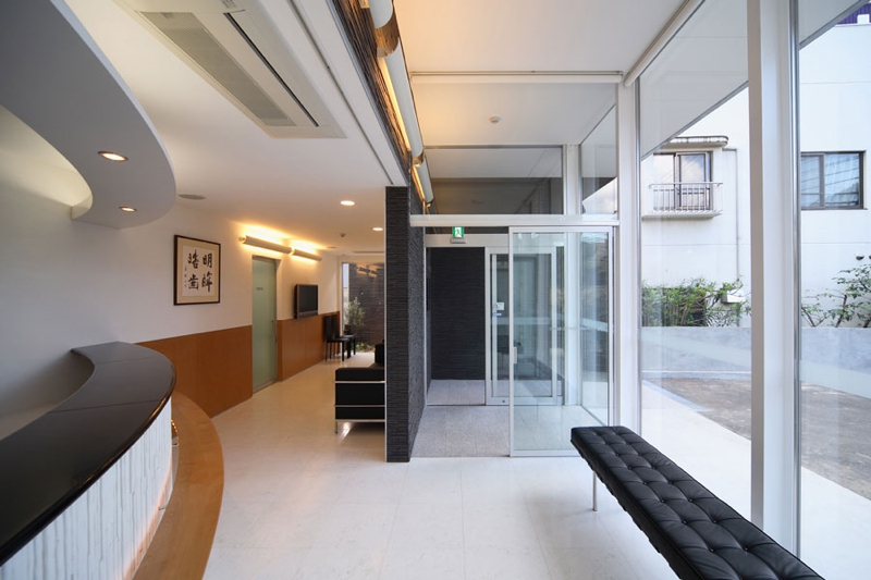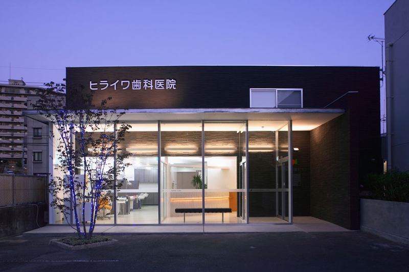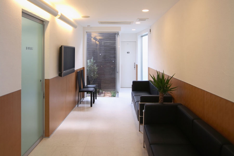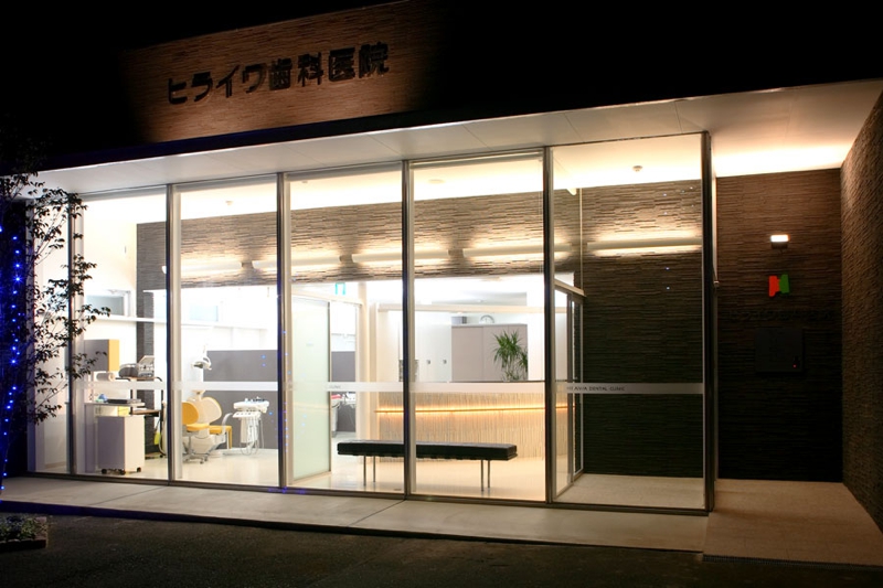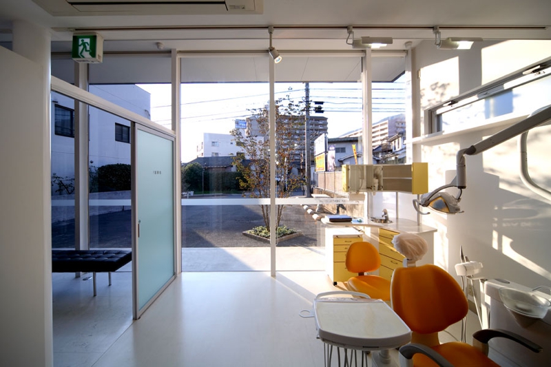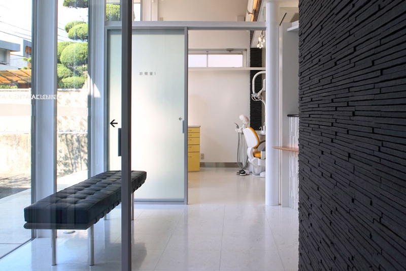 前面道路に対して、受付、待合室を1.5層吹抜けのガラス面にすることで、医院内に解放感を造り出しています。オープンな地域歯科医療をめざす診療所は、光のきらめき、自然素材を使用した有機的なデザイン、内部空間はホワイトを基調、間接照明によるやわらかな空間とし、清潔感、透明感を表現しています。