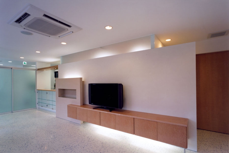 移転の要望として、2階に診察室があることで今まで出来なかった高齢者、障害者の車椅子対応を可能にするために、院内をバリアフリーにすることでした。外部もそれにともないアプローチは緩やかなスロープを設けました。待合は患者が待つ間くつろげる空間とするため、壁にハイビジョンのTVを取付け、マガジンラックも造付けの家具を配置し、受付のカウンターは販売用の歯ブラシ等の展示のためガラスケースとしています。また壁上部を50cmガラスとすることで、奥のスッタフ室に採光が確保できるようにしています。