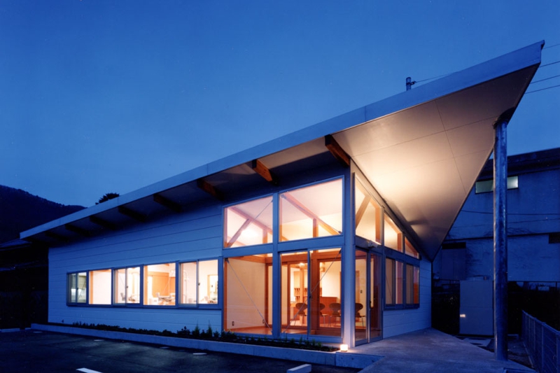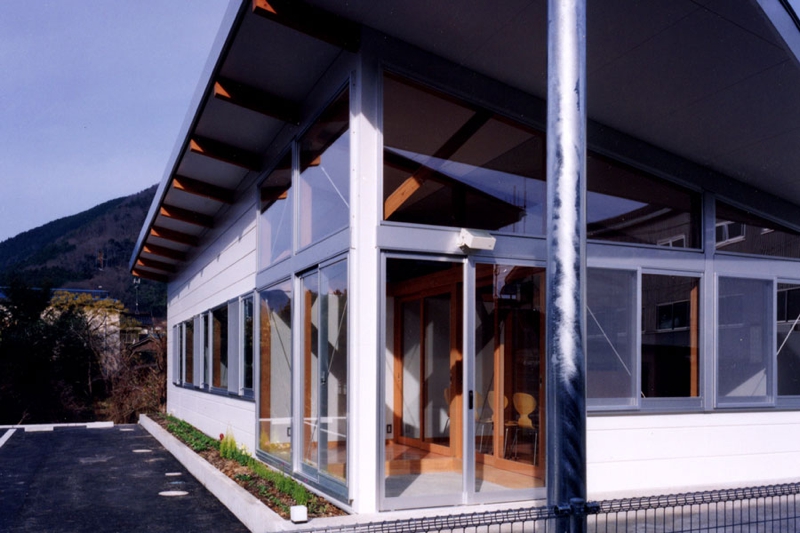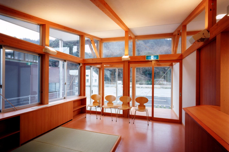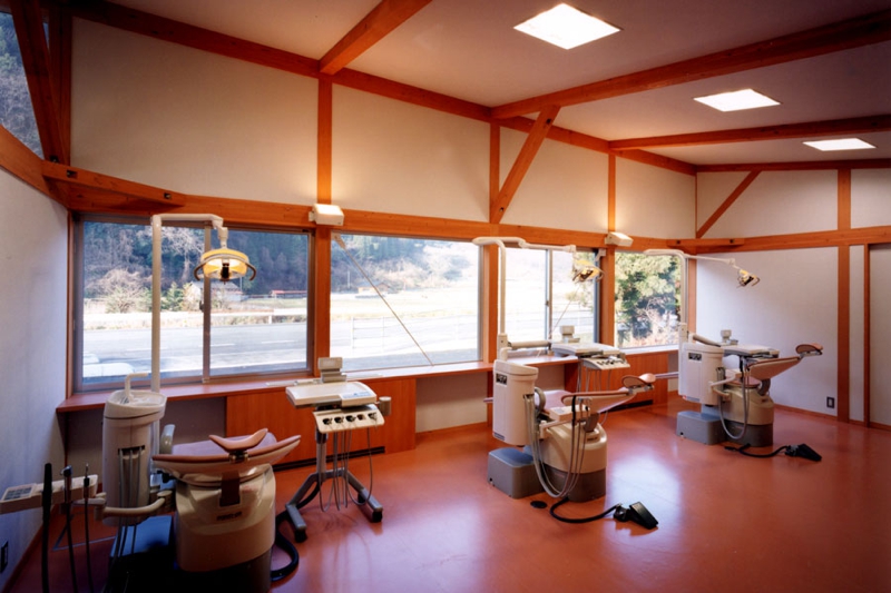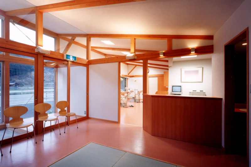 県北に位置する地域診療をめざすこの建物は、1.8Mグリットの木造骨組から構成されることで、秩序と連続性をもつ内部空間となり、また筋違を鉄筋のたすき掛けとすることで強度と軽快感をつくり出しています。